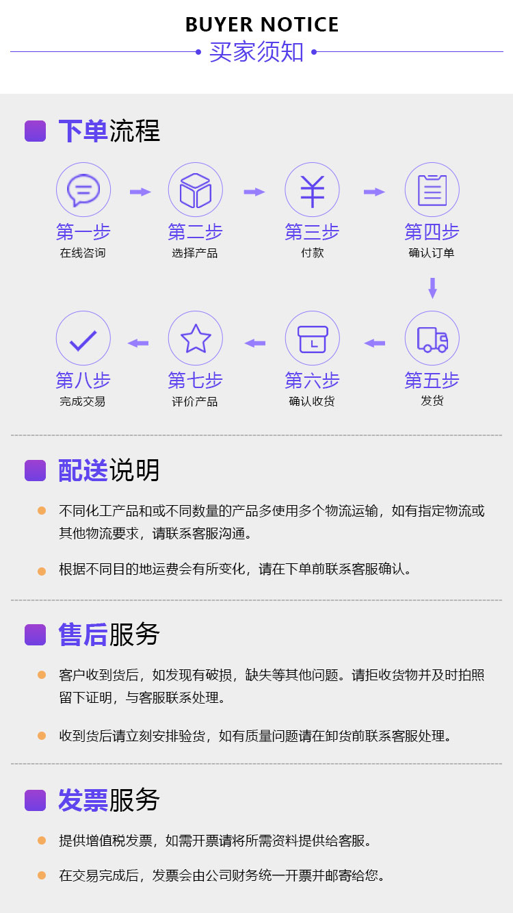 平台服务说明: 酯香香为专业的化学品第三方交易平台及行业互联网信息服务分享者,酯香香(含PC网站、小程序)所展示的商品/服务信息标题、价格、详情介绍等信息内容系入驻商/品牌经营者提供或发布,其真实性、准确性和合法性均为入驻品牌商家/经营者负责。酯香香作为行业首个专注于酯类化学品的采购商城,非常希望提醒广大下游采购商,在购买商品前谨慎核实产品信息,供应商资质。如您对商品/服务的各种内容信息存在任何疑问疑惑,请在购买前通过页面联系确认;酯香香存在海量的商品和服务信息,如您发现入驻商页面有任何违法/侵权信息,请立即向我们举报并提供有效线索,我们将竭力处理纠正。